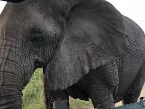 When we found the elephants that afternoon, they were heading up a long, narrow road with thick bush on either side. Siya stopped the car about forty yards behind them. While we were watching them, we heard elephants trumpeting as they were coming up the hill behind us. It was two very large males, Shaka and Bafana. Siya said they had probably been fighting as Shaka was feisty. He was trumpeting and dancing around, shaking his trunk. Suddenly, he came barreling down the road straight for us. Jay and I were in the back of the land cruiser. “I think it is time to move,” Jay said quietly. Our ranger, Siya, tried to start the car but because it is diesel and needs to warm up, we weren’t going anywhere and Shaka was coming fast. I turned around to face the front and got as small as possible bracing myself. Both Jay and one of the other passengers reported that one of Shaka’s tusks came in between Jay and me. With his big body having all that momentum coming down the hill, he kept moving alongside the vehicle. About ten feet in front of us, he turned around and after a minute or two of dancing around came back at us.