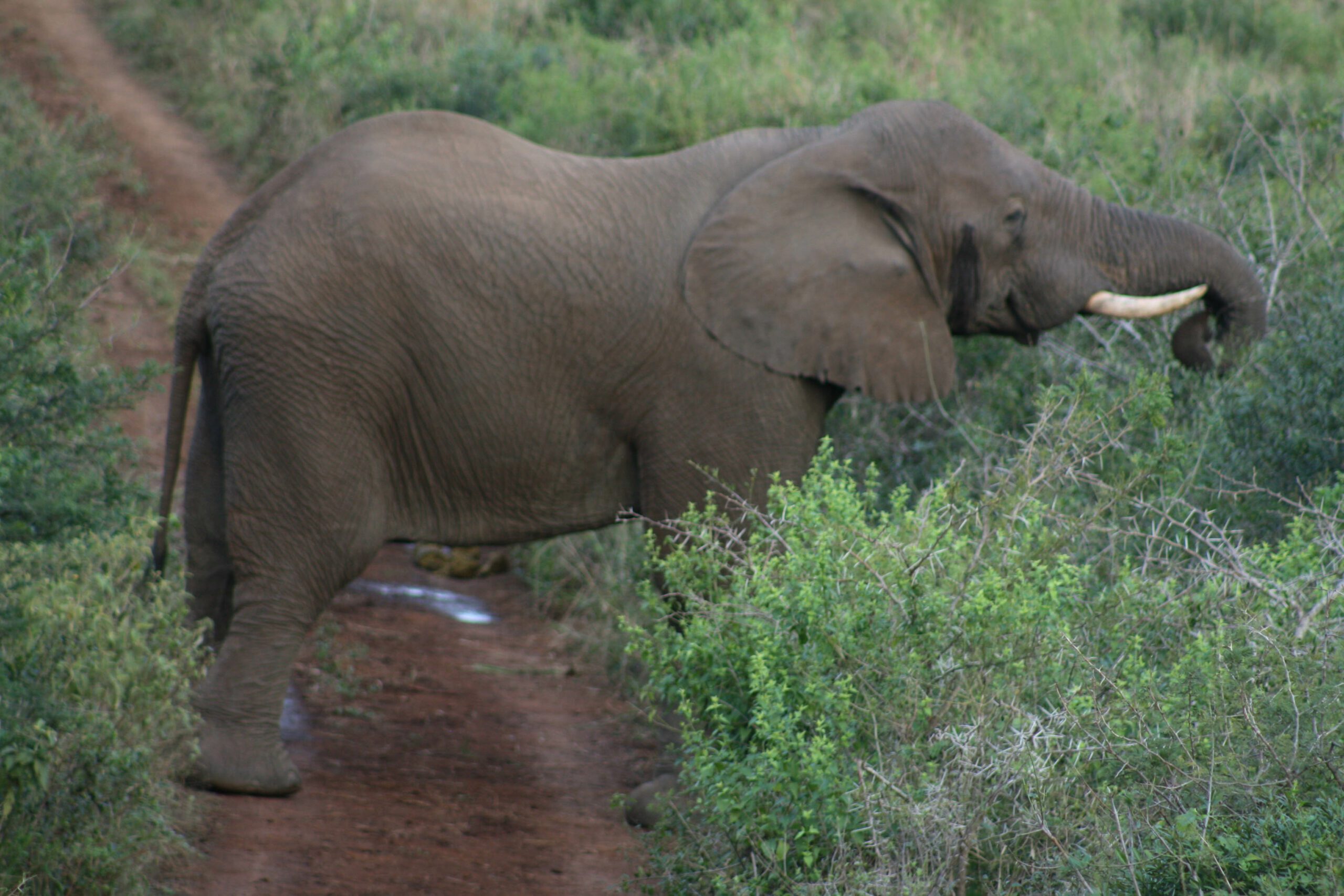 When we found the elephants that afternoon, they were heading up a long, narrow road with thick bush on either side. Siya stopped the car about forty yards behind them. While we were watching them, we heard elephants trumpeting as they were coming up the hill behind us. It was two very large males, Shaka and Bafana. Siya said they had probably been fighting as Shaka was feisty. He was trumpeting and dancing around, shaking his trunk. Suddenly, he came barreling down the road straight for us. Jay and I were in the back of the land cruiser. “I think it is time to move,” Jay said quietly. Our ranger, Siya, tried to start the car but because it is diesel and needs to warm up, we weren’t going anywhere and Shaka was coming fast. I turned around to face the front and got as small as possible bracing myself. Both Jay and one of the other passengers reported that one of Shaka’s tusks came in between Jay and me. With his big body having all that momentum coming down the hill, he kept moving alongside the vehicle. About ten feet in front of us, he turned around and after a minute or two of dancing around came back at us.