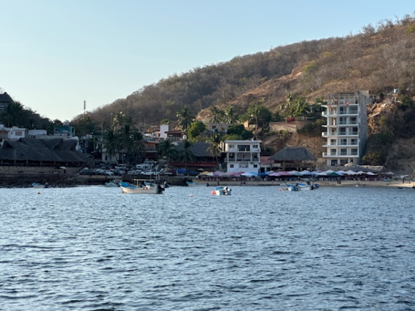The cobblestone street runs along the beach and up the side of a hill. As the road curves around the hill, it turns to dirt, and the dwellings disappear. It continues up and around the mountain. This is the only road in and out. There is no internet or cell service. Several pangas are anchored in the bay telling me their livelihood depends on the sea which is quite common in these coastal communities.